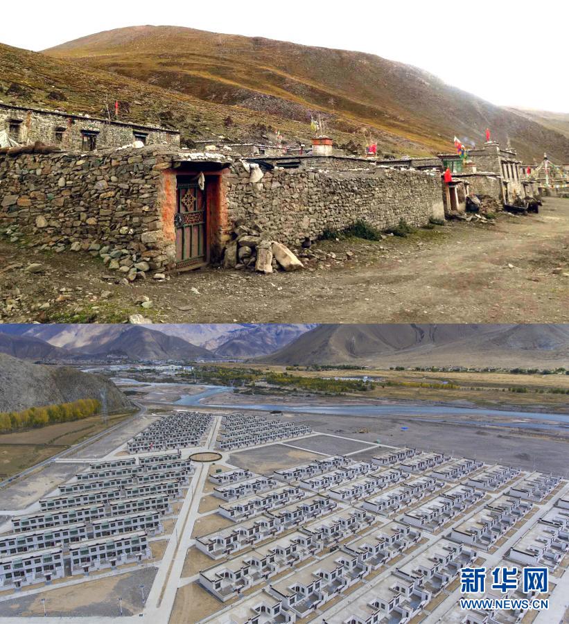 拼版照片:上圖是曾經(jīng)的西藏日喀則市拉孜縣查務(wù)鄉(xiāng)民房(資料照片);下圖是西藏日喀則市南木林縣孔阿村易地搬遷點(diǎn)(2018年9月28日南木加攝,無人機(jī)照片 )新華社發(fā)