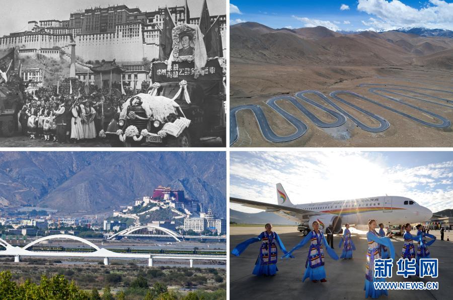拼版照片:左上是1954年12月25日,康藏(今川藏)、青藏兩條公路勝利通車到拉薩。圖為在布達(dá)拉宮前舉行的盛大通車儀式(資料照片);左下是青藏鐵路列車抵達(dá)拉薩(2016年6月27日新華社記者普布扎西 攝);右上是通往珠峰的公路(2017年5月19日新華社記者普布扎西 攝)右下是西藏航空有限公司正式通航(2011年7月26日新華社記者 覺果攝)新華社發(fā)