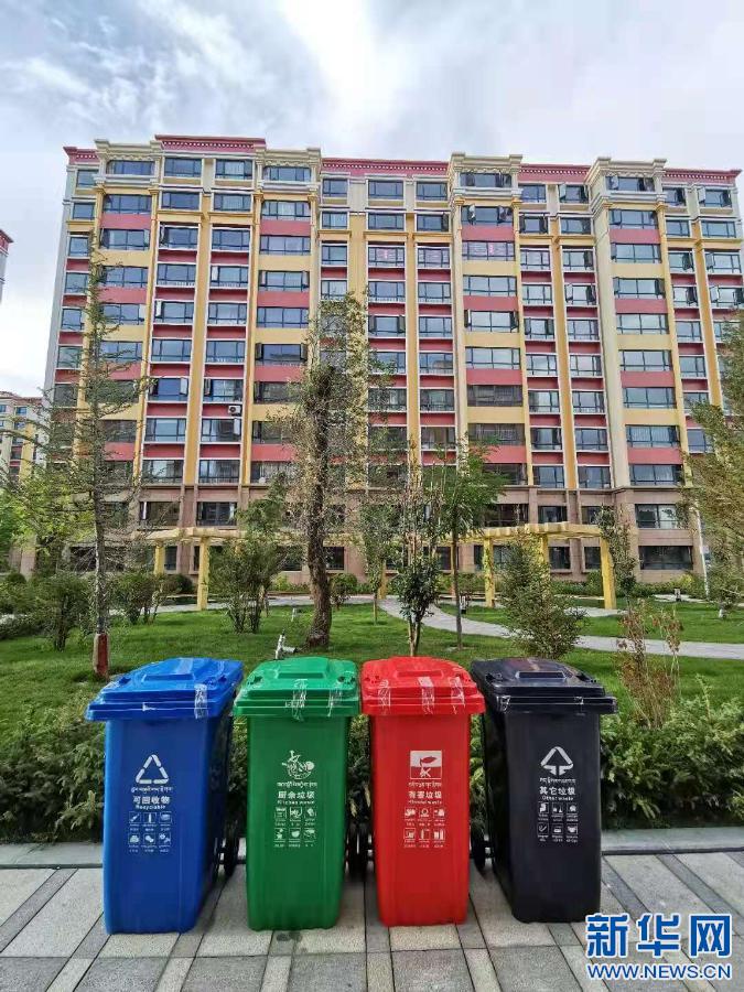 拉薩一新建成小區(qū)內擺放的垃圾分類回收桶(2020年9月6日攝)。新華社記者 普布扎西 攝