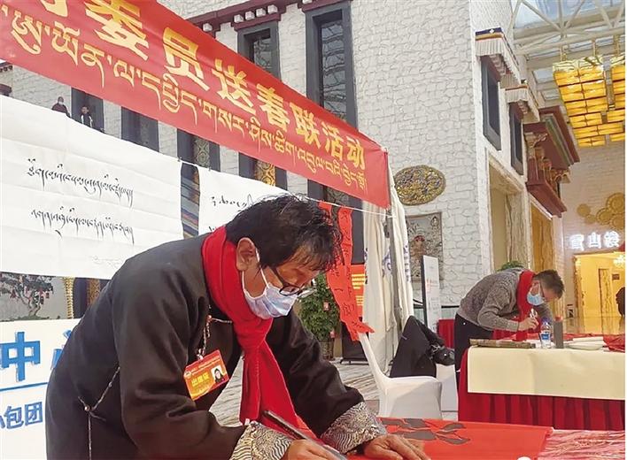 “這次我和各位書法家集聚于此,為委員們題寫春聯(lián)和書法作品,深感榮幸,這不僅進(jìn)一步弘揚(yáng)了傳統(tǒng)文化,更為大家送上了新春祝福,表達(dá)了美好的新年愿景,也希望我們書寫的作品通過各位委員傳遞到廣大群眾中,弘揚(yáng)主旋律、傳遞正能量,切實(shí)發(fā)揮文藝激勵(lì)人心的作用?!敝袊?guó)書法家協(xié)會(huì)會(huì)員、中國(guó)美術(shù)家協(xié)會(huì)會(huì)員、自治區(qū)書法家協(xié)會(huì)副主席、拉薩市書法家協(xié)會(huì)主席高延鴻說。