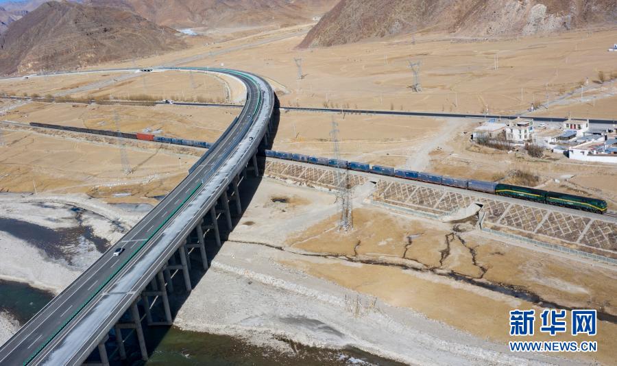 這是拉薩至那曲高等級(jí)公路(右)和青藏鐵路沿線風(fēng)光(1月28日攝,無(wú)人機(jī)照片)。新華社記者 晉美多吉 攝