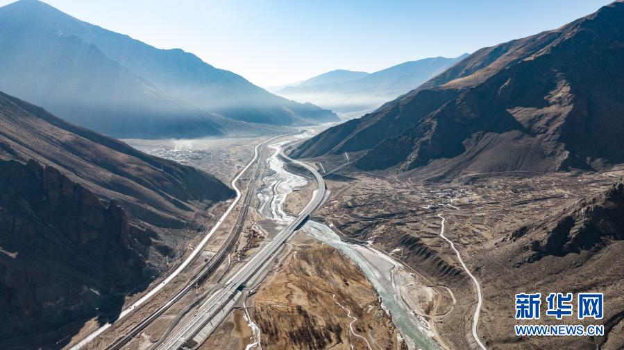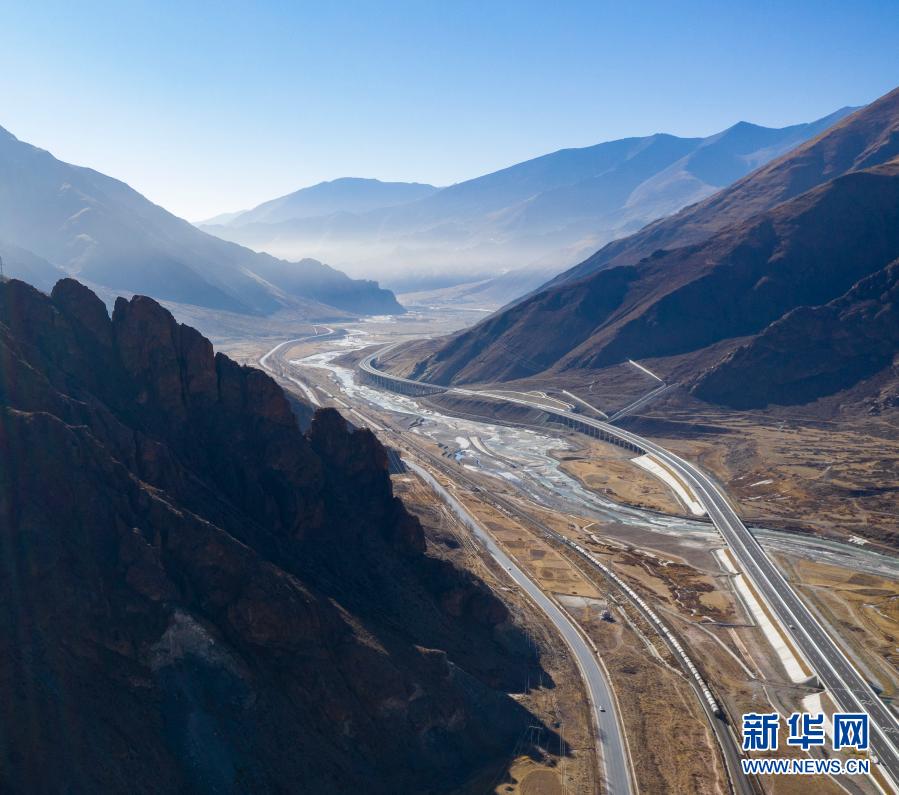 這是拉薩至那曲高等級(jí)公路和青藏鐵路沿線風(fēng)光(1月28日攝,無(wú)人機(jī)照片)。新華社記者 普布扎西 攝