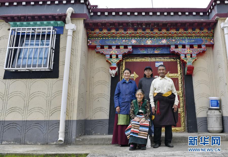 山南市貢嘎縣森布日村一戶村民在自家門前合影(2020年7月29日攝)。新華社記者 張汝鋒 攝