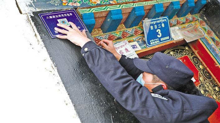 圖為八廓派出所民警在居民大院門(mén)口張貼居住證“碼”上辦二維碼。格桑倫珠 尼瑪拉珍 攝