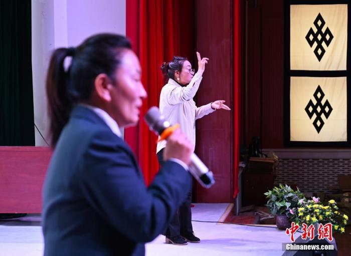 圖為3月11日,拉薩市人民檢察院未成年檢察廳負責人普布倉覺在做法治宣講,拉薩市特殊教育學校的手語老師為聾啞學生翻譯。 中新社記者 趙朗 攝