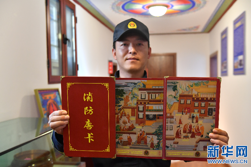 布達(dá)拉宮消防救援大隊(duì)二級指揮員喬宣茜展示消防救援大隊(duì)推出的消防宣傳唐卡(3月4日攝)。新華社記者 孫瑞博 攝