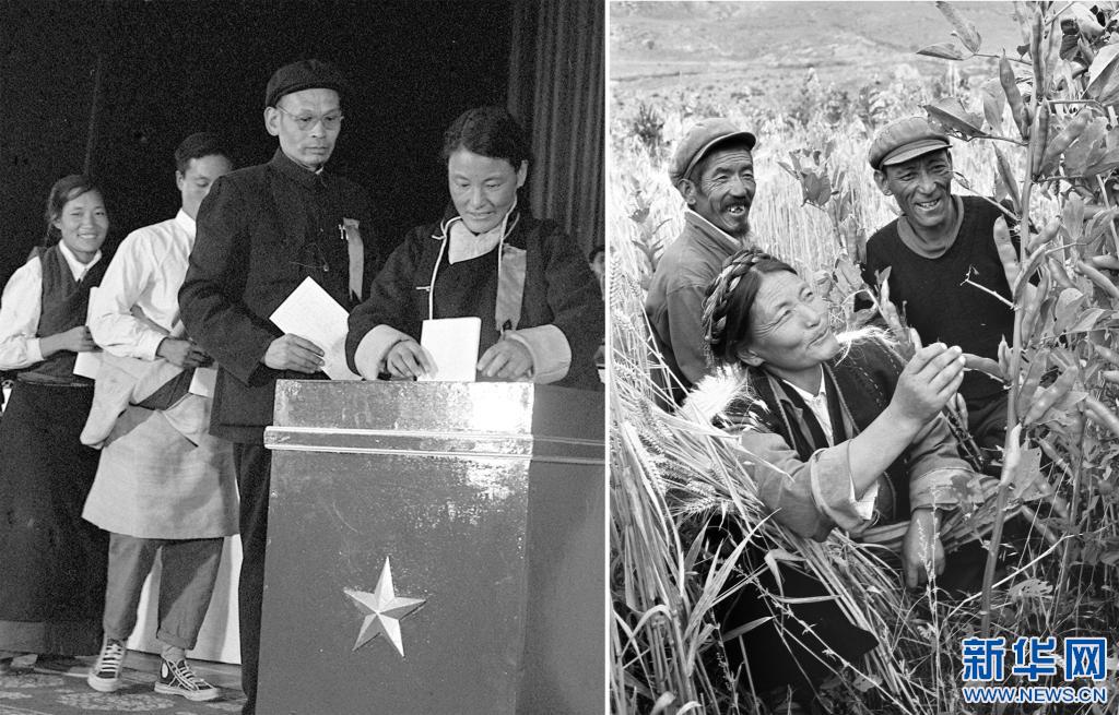 拼版照片:左圖:1965年9月8日,西藏自治區(qū)第一屆人民代表大會(huì)第一次會(huì)議選舉了西藏自治區(qū)主席、副主席和自治區(qū)人民委員會(huì)委員。 次仁拉姆(右一)作為代表正在投票。(新華社資料照片)。右圖:1979年次仁拉姆(前)帶領(lǐng)公社社員開展科學(xué)種田,在田間觀察冬小麥和蠶豆套種情況(新華社資料照片)。新華社發(fā)