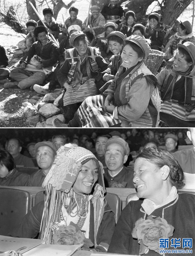 拼版照片:上圖:1978年次仁拉姆(前)勞動(dòng)休息時(shí)和社員交談(新華社資料照片)。下圖:1979年次仁拉姆(右)在全國(guó)勞動(dòng)模范授獎(jiǎng)大會(huì)上(新華社資料照片)。新華社發(fā)