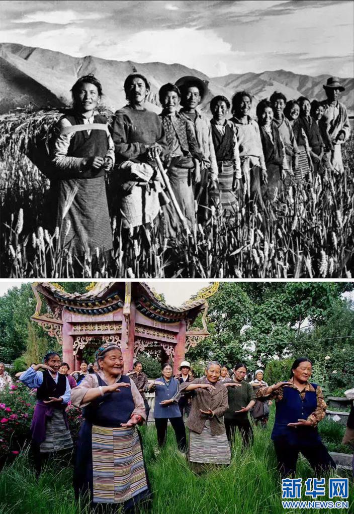 拼版照片:上圖:次仁拉姆(左一)和互助組成員在田間勞作(資料照片)。下圖:次仁拉姆(左前)在社區(qū)居委會(huì)里學(xué)習(xí)太極拳(新華社發(fā) 車剛 攝)新華社發(fā)