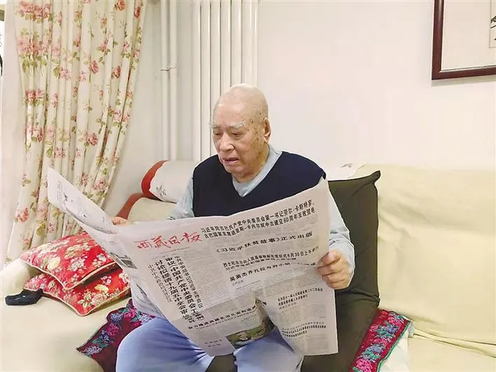 圖為開斗山在北京家中閱讀《西藏日?qǐng)?bào)》
