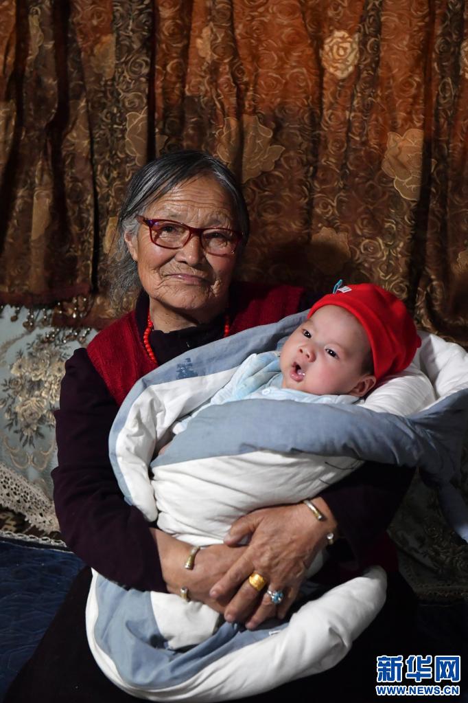 在林芝市米林縣吞北村的家中,布魯老人(右)慈祥地看著小孫子久美多丹(3月28日攝)。新華社記者 孫瑞博 攝