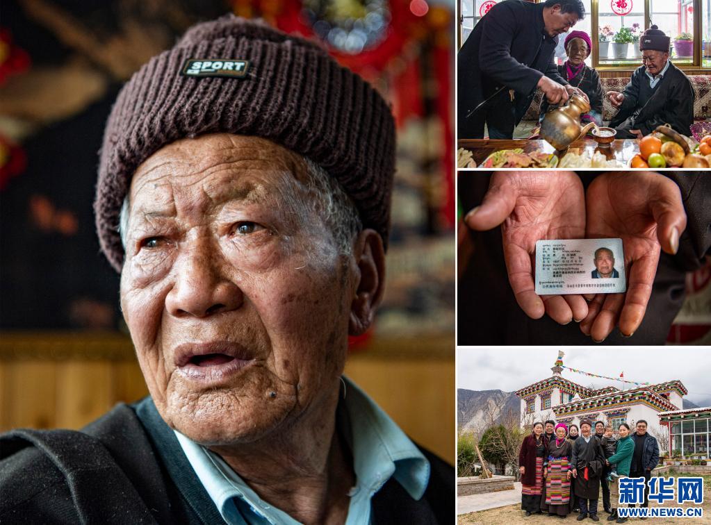 這是一張拼版照片,左圖為達確的肖像(1月14日新華社記者普布扎西攝);右上圖為家人給達確老人唱歌敬酒(1月14日新華社記者普布扎西攝);右中圖為達確的身份證(1月14日新華社記者晉美多吉攝);右下圖為達確(中)一家人的合影(1月14日新華社記者晉美多吉攝)。新華社發(fā)
