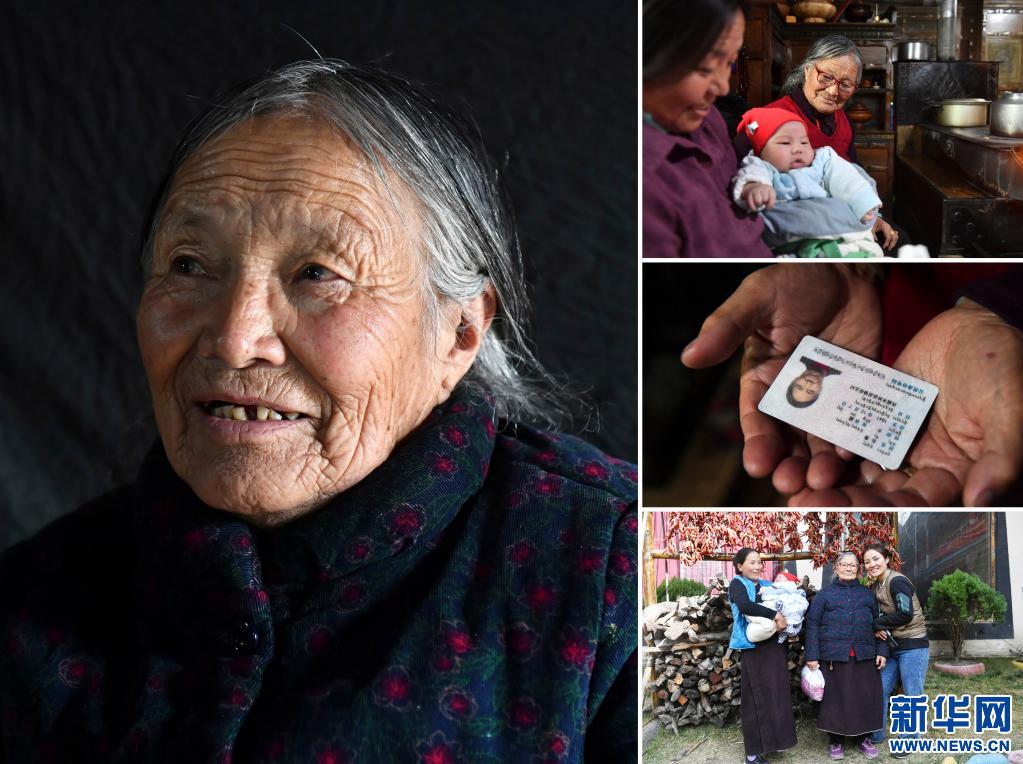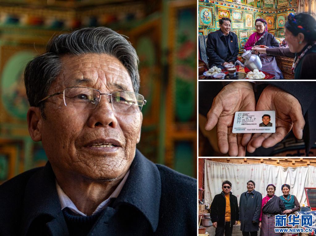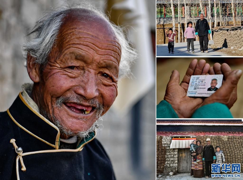 這是一張拼版照片,左圖為邊巴倉決的肖像(3月19日新華社記者張汝鋒攝);右上圖為邊巴倉決(左二)和鄰居在家里拉家常(3月19日新華社記者孫瑞博攝);右中圖為邊巴倉決的身份證(3月19日新華社記者孫瑞博攝);右下圖為邊巴倉決和孫子孫媳在一起(3月19日新華社記者張汝鋒攝)。新華社發(fā)