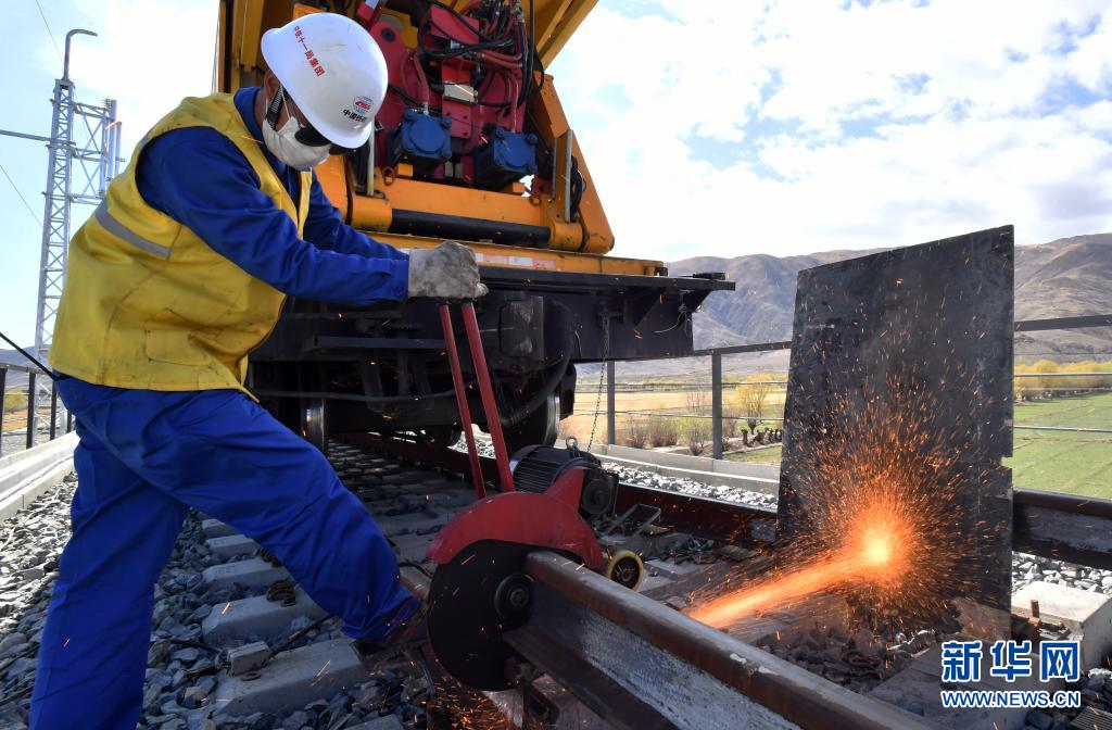 中鐵十一局工人在川藏鐵路拉薩至林芝段進(jìn)行長(zhǎng)鋼軌無縫焊接作業(yè)(2020年4月16日攝)。新華社記者 覺果 攝