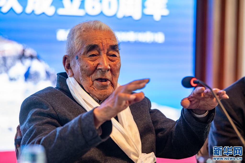 2020年10月1日,87歲高齡的老登山家貢布在慶祝中國西藏登山隊成立60周年活動上致辭。新華社記者孫非攝