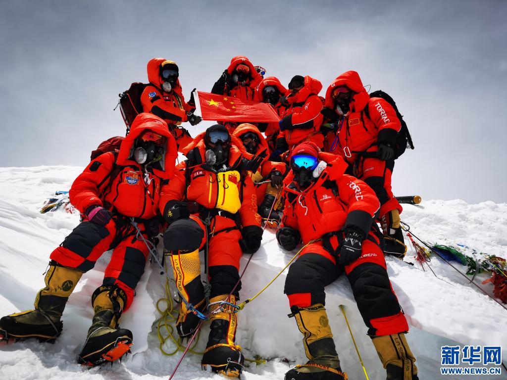 2020年5月27日,2020珠峰高程測量登山隊在峰頂合影留念。新華社特約記者扎西次仁攝