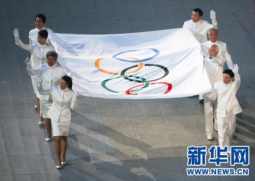 2008年8月8日,中國首位珠峰北坡登頂?shù)呐巧郊遗硕啵ㄗ筮厪那皵?shù)第二位)在北京奧運會開幕式上,手執(zhí)奧林匹克會旗入場。新華社發(fā)