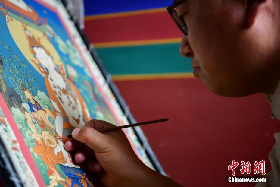 6月12日,2021年“文化和自然遺產(chǎn)日”西藏非遺展演展示系列活動在拉薩舉行?;顒蝇F(xiàn)場融入了文藝演出、非遺展演、非遺產(chǎn)品展銷等內(nèi)容,市民游客可親身體驗非遺產(chǎn)品的制作過程。圖為非遺傳承人在手繪唐卡。 中新社記者 貢嘎來松 攝