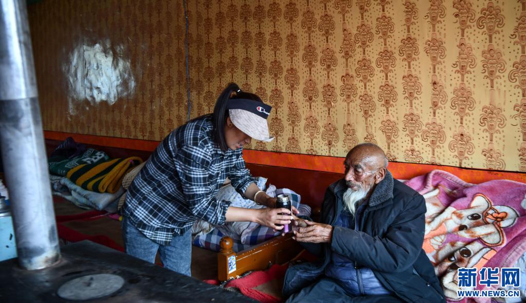 次多杰老人的孫女在給老人敬茶(4月25日攝)。新華社記者 晉美多吉 攝