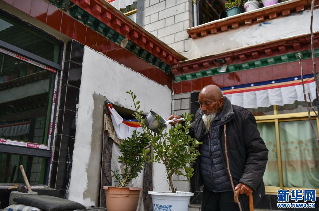 次多杰老人在給家里的花澆水(4月25日攝)。新華社記者 普布扎西 攝