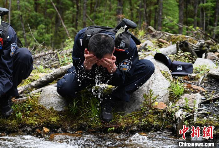 圖為移民管理警察在溪邊休息洗臉。趙朗 攝