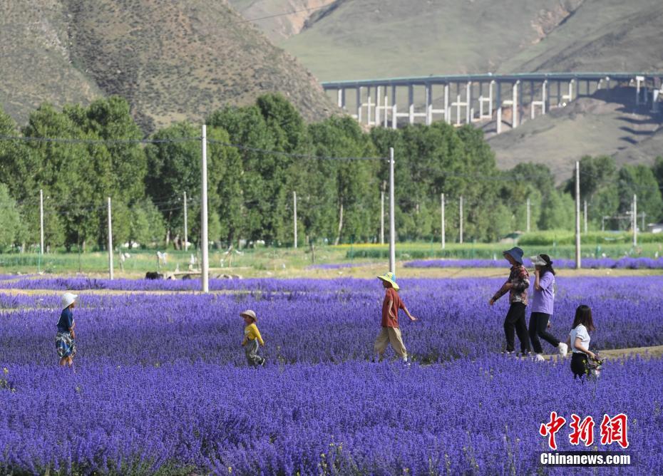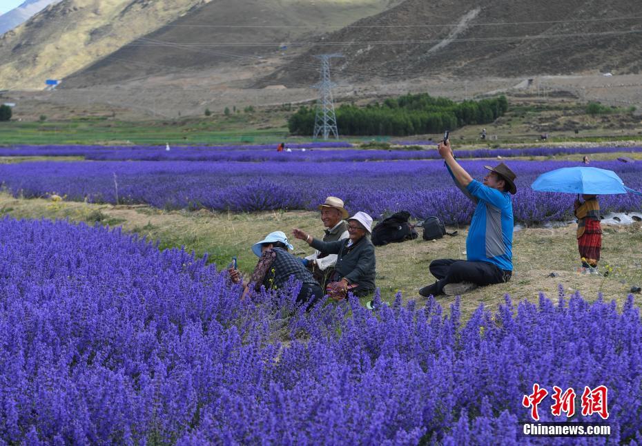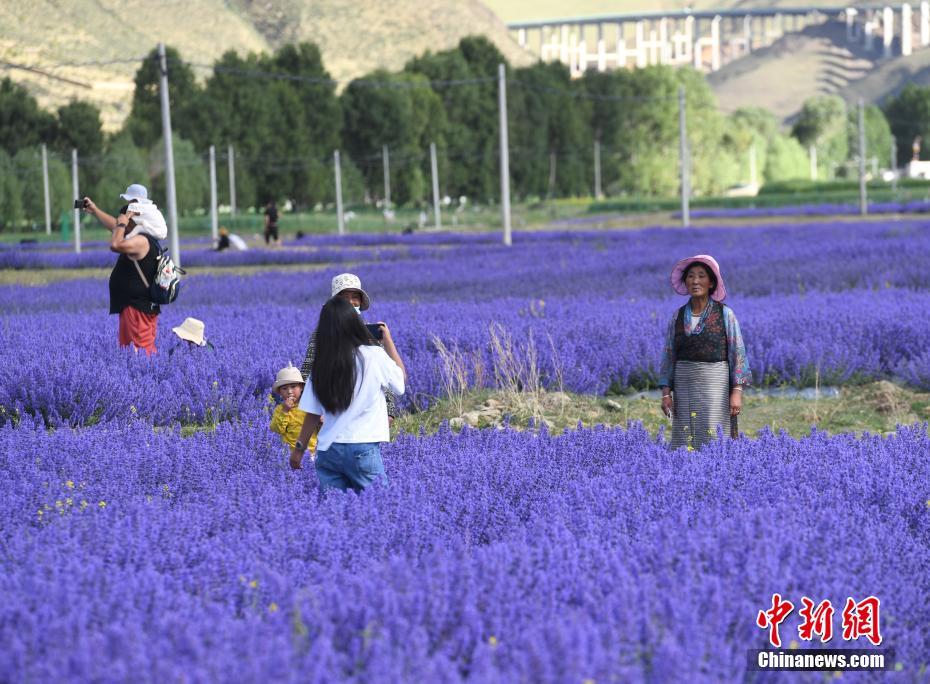 6月25日,位于西藏自治區(qū)拉薩市達(dá)孜區(qū)新倉(cāng)村貝拉莊園的100畝薰衣草花海競(jìng)相綻放,吸引不少游客和當(dāng)?shù)厥忻袂皝?lái)游玩、拍照。中新社記者 貢嘎來(lái)松 攝