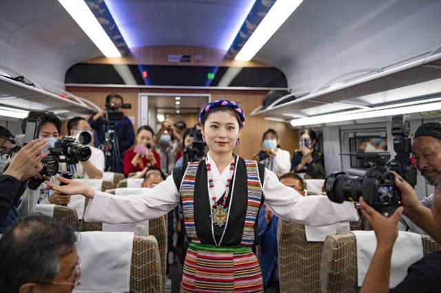 西藏首列復(fù)興號的列車員在進行當?shù)胤棻硌?6月25日攝)。 新華社記者 普布扎西 攝