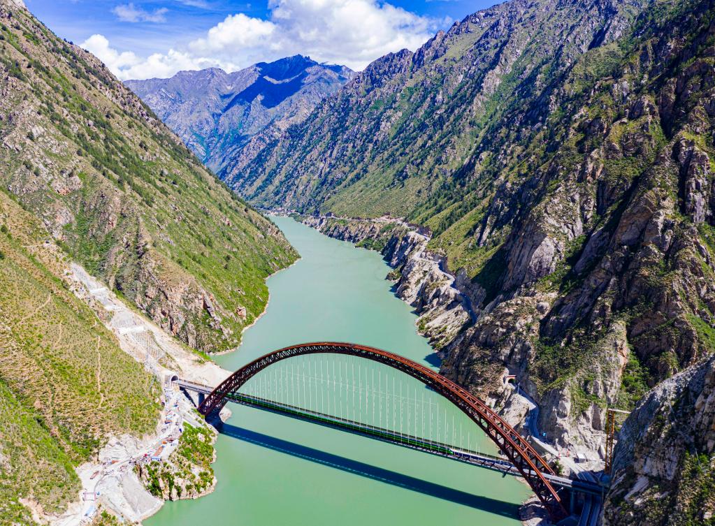 試運行的復興號列車行駛在藏木雅魯藏布江雙線特大橋(6月17日攝,無人機照片)。新華社記者 普布扎西 攝