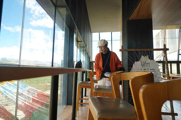 從正門進(jìn)入,穿過牦牛文化空間走廊,便可到能夠以最佳視角欣賞念青唐古拉山的VR觀景臺。緊鄰觀景臺右側(cè),是一間擺放當(dāng)?shù)匚膭?chuàng)產(chǎn)品、各類書籍的觀景咖啡廳。該咖啡廳的兩面墻體設(shè)計為超大落地窗,在此休息的游客可以邊品嘗咖啡,邊欣賞念青唐古拉山及拉多草原的美景。走進(jìn)咖啡廳,記者看到不少在這里休息的游客都在低頭寫著什么,經(jīng)咖啡廳負(fù)責(zé)人介紹:“這些游客是在寫明信片,我們這里不僅提供餐飲,還提供印有本地風(fēng)景的明信片,并同中國郵政合作,幫助游客按時將明信片寄到他們的親朋好友手中,讓游客們的旅途變得更有意義。”