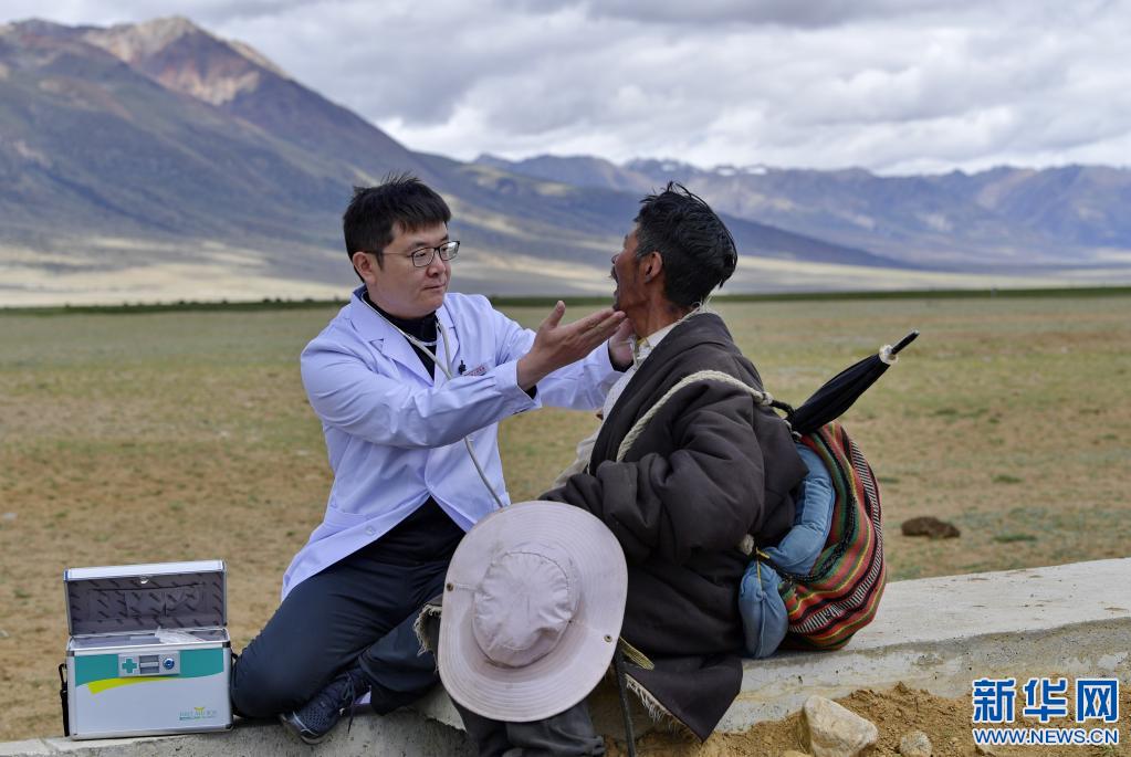 王克明(左)在西藏當(dāng)雄縣格達(dá)鄉(xiāng)格達(dá)村牧場(chǎng)為牧民義診(6月19日攝)。新華社記者 張汝鋒 攝