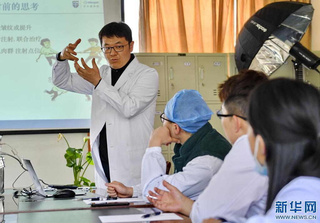 在西藏自治區(qū)人民醫(yī)院,王克明(左一)在進(jìn)行醫(yī)學(xué)整形外科培訓(xùn)(5月14日攝)。新華社記者 張汝鋒 攝