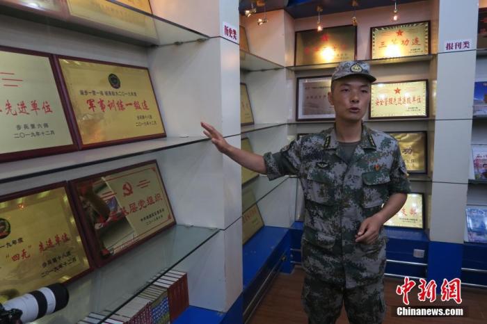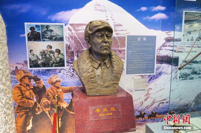 近日,中新社記者隨采訪團(tuán)重走上世紀(jì)50年代中國人民解放軍進(jìn)藏先遣連的入藏路線。圖為南疆軍區(qū)某合成團(tuán)1連榮譽(yù)室,雕像是進(jìn)藏先遣英雄連總指揮李狄三。 中新社記者 楊程晨 攝