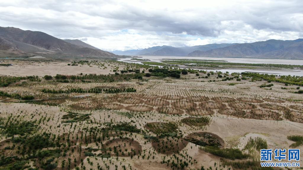 雅魯藏布江山南段沙丘上人工造林的樹苗(7月20日 無(wú)人機(jī)攝)。新華社記者 晉美多吉 攝