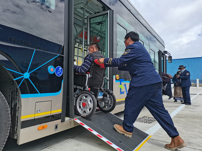 3日,拉薩市公交運(yùn)營有限公司舉行拉薩公交經(jīng)開區(qū)B區(qū)公交首末站啟用暨大站快線開通儀式。現(xiàn)場,坐在輪椅上的市民覺列準(zhǔn)備乘坐新公交車,駕駛員接到乘車提示后,采取制動措施,將車輛熄火后來到后門處,將無障礙踏板翻開并固定好,順利幫其上車。