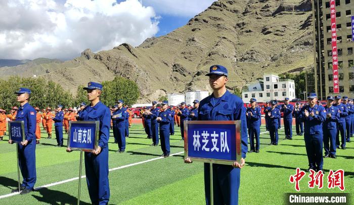 圖為西藏自治區(qū)消防救援總隊(duì)7個(gè)支隊(duì)代表參加配發(fā)儀式。貢桑拉姆 攝