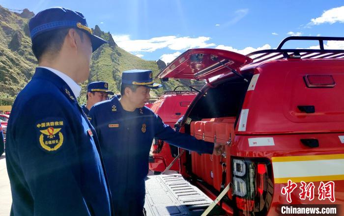 圖為西藏自治區(qū)消防救援總隊(duì)相關(guān)負(fù)責(zé)人觀摩車輛及隨車器材。貢桑拉姆 攝