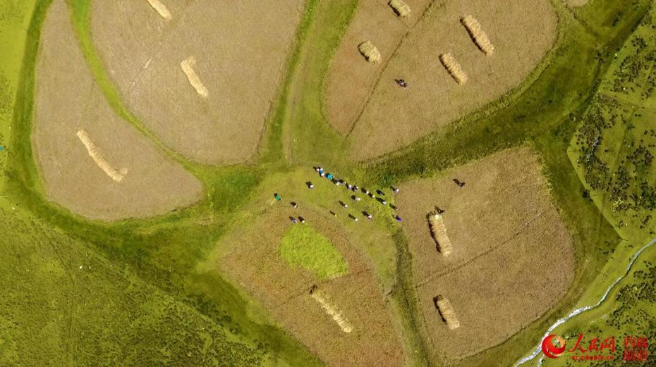 九月的西藏,已進入青稞成熟收割時節(jié)。記者來到拉薩市曲水縣熱堆村,成片成片成熟了的青稞,金黃耀眼。村民們抓緊天氣晴好的時機,互幫互助忙收割,確保顆粒歸倉。地頭田間,有的已被割倒束成捆,也有的仍在迎風搖曳,等待收割,村民們揮舞著鐮刀,將成熟的青稞收割、扎捆、然后堆砌成一排排整齊的青稞垛子,用拖拉機將青稞運回家,再上架晾曬,看著沉甸甸的麥穗,聞著空氣中彌漫著沁人心脾的青稞香,村民們臉上露出了喜悅的微笑。無人機鳥瞰青稞田地。人民網(wǎng) 次仁羅布攝