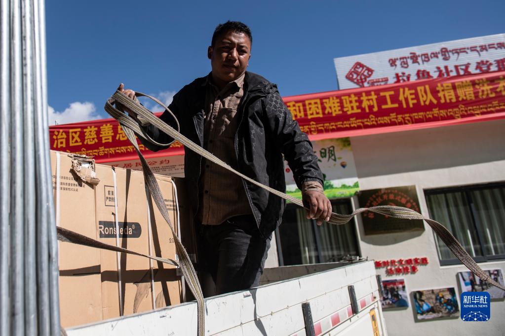9月7日,拉薩市墨竹工卡縣貼朗村駐村工作隊(duì)隊(duì)員楊愛軍(右)和當(dāng)雄縣加多村駐村工作隊(duì)隊(duì)員拉平查收全自動(dòng)洗衣機(jī)。新華社記者 孫瑞博 攝