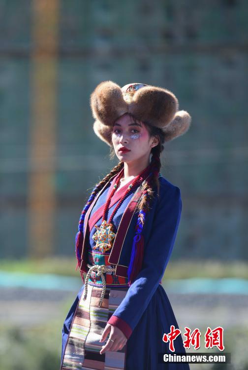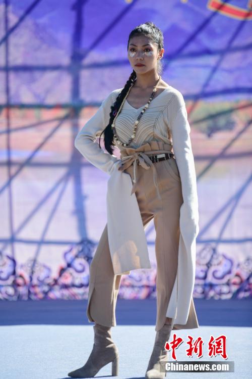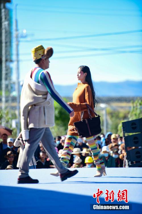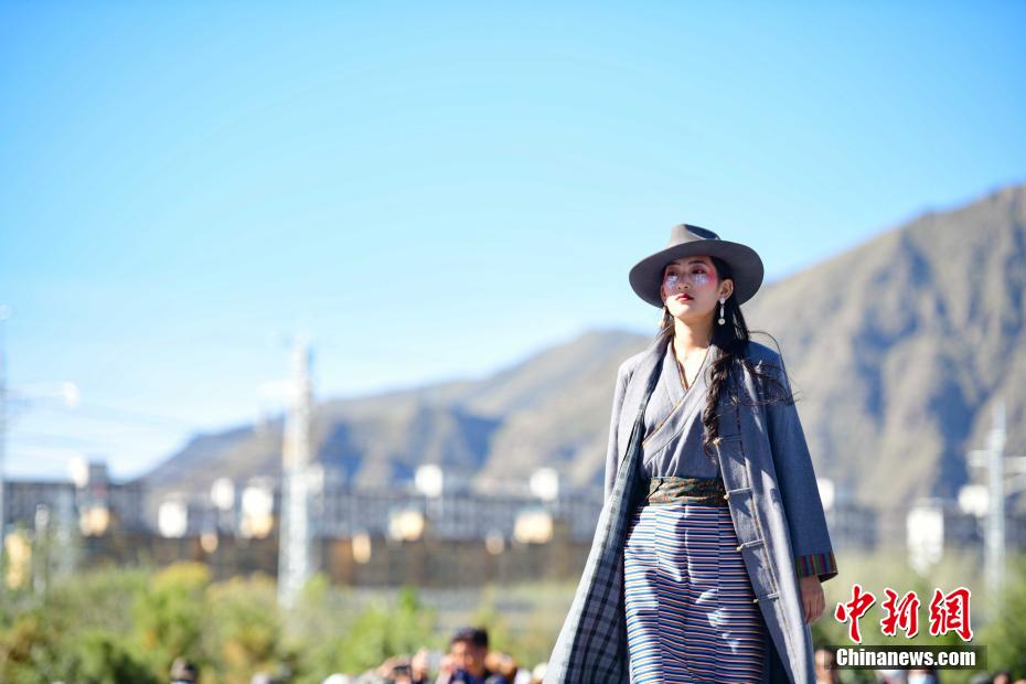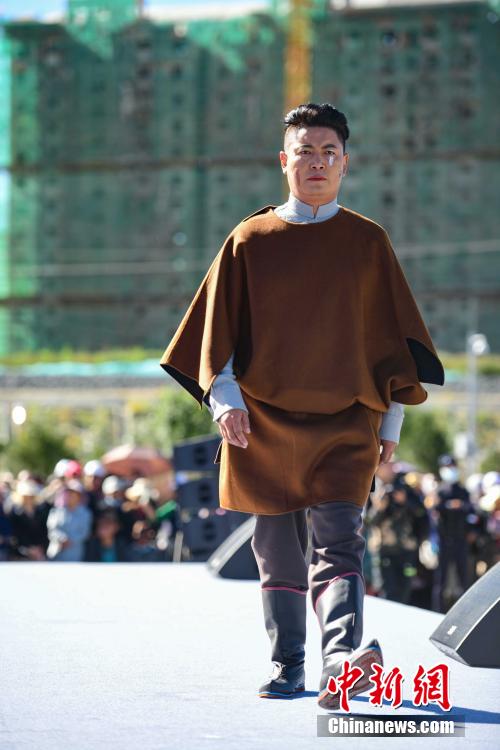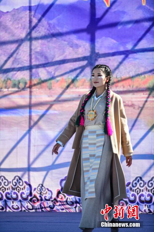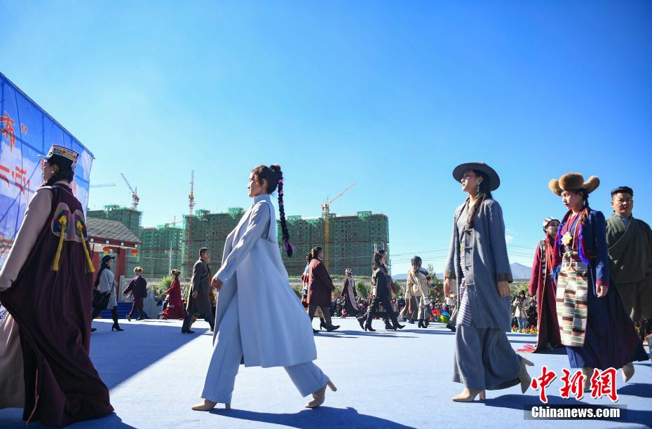 圖為當(dāng)?shù)夭刈迥L厣碇把鹏敳夭肌爆F(xiàn)代藏裝服飾進(jìn)行走秀。貢嘎來(lái)松 攝
