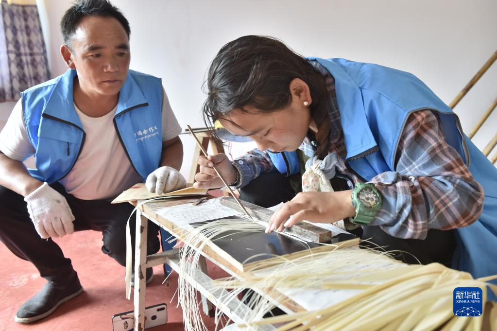 9月15日,西藏定結(jié)縣陳塘鎮(zhèn)農(nóng)民、夏爾巴竹器手工藝傳承人加布(左)指導(dǎo)村民用竹皮編織唐卡。新華社發(fā)(索朗羅布 攝)