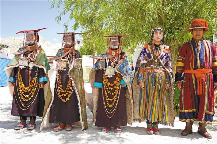 巴桑歐珠介紹,目前,科迦村保存有8套科迦服飾,也有人叫這種服飾為“飛天服飾”,其中,以婦女的“孔雀服飾”最為昂貴。這種服飾價(jià)值幾十萬元甚至數(shù)百萬元的主因是其多用黃金、白銀、松石、瑪瑙、珊瑚、琥珀、珍珠、田黃等金銀珠寶鑲嵌裝飾,每套服飾承載和沉淀著千百年的文化。