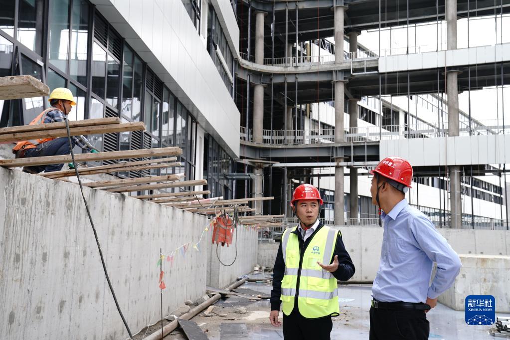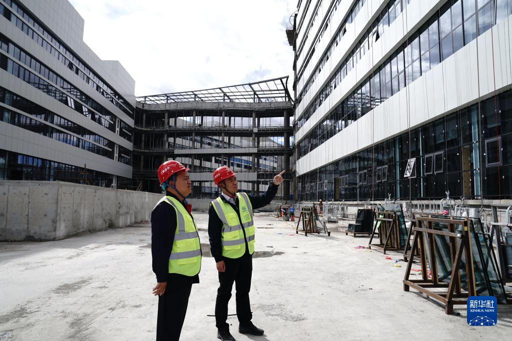 中鐵建工集團(tuán)西藏自治區(qū)醫(yī)院項(xiàng)目經(jīng)理張磊(右)與項(xiàng)目黨支部書(shū)記王曉飛(左)查看施工情況。(2021年9月18日攝)。新華社記者 劉洪明 攝