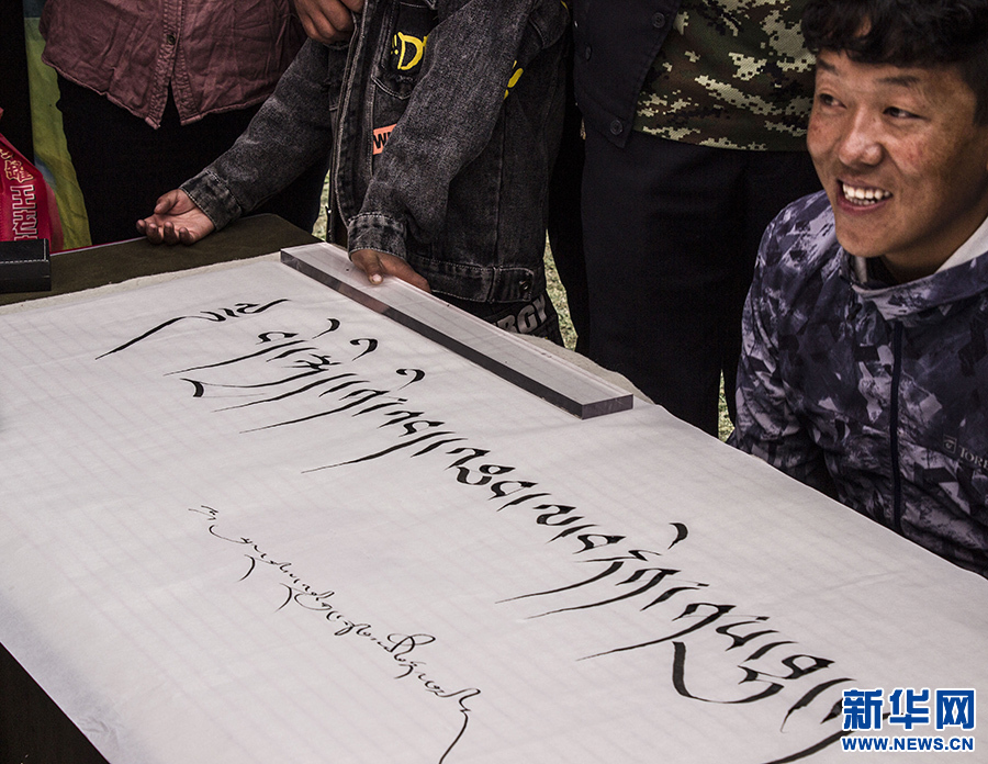 9月23日,群眾在活動(dòng)現(xiàn)場(chǎng)觀賞藏文書法。新華網(wǎng) 達(dá)次 攝
