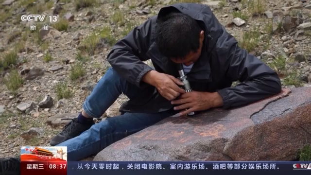 總臺(tái)記者 陳琴:現(xiàn)在我們是跟隨科考隊(duì)員來(lái)到了海拔4700米的加林山巖畫這么一個(gè)分布區(qū)域,這里的位置就是在尼瑪縣榮瑪鄉(xiāng)依布茶卡鹽湖的旁邊,我們看見(jiàn)科考隊(duì)員正在對(duì)這幅巖畫進(jìn)行登記和記錄。
