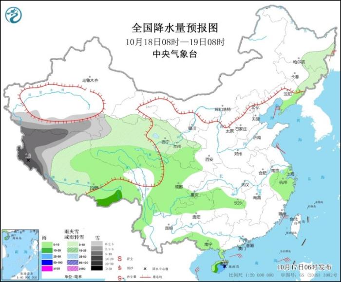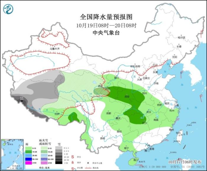 10月19日08時(shí)至20日08時(shí),新疆東南部、西藏中西部、青海西部等地部分地區(qū)有小到中雪,其中,西藏西南部部分地區(qū)有大到暴雪(10~11毫米)。西藏東南部、甘肅南部、陜西中南部、山西南部、河南西南部、湖北西部、湖南北部等地部分地區(qū)有中雨(見圖3)。
