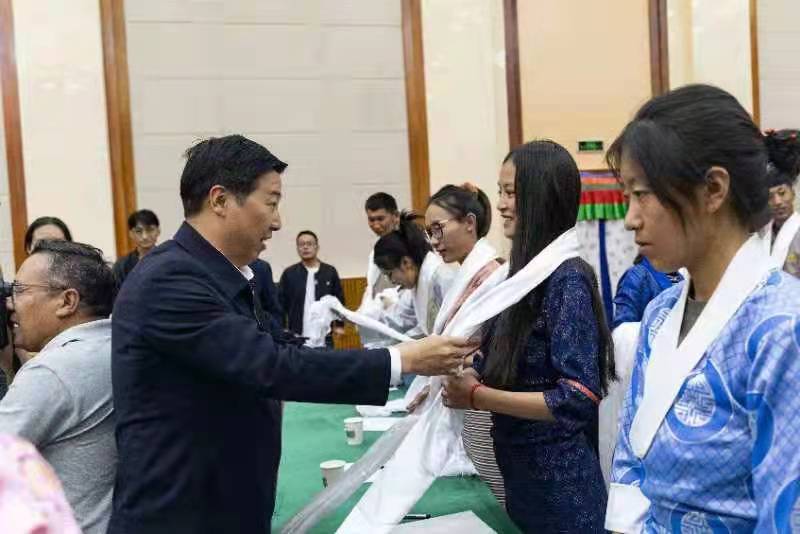 10月14日下午,湖北省第九批援藏工作隊(duì)領(lǐng)隊(duì)、山南市委副書記、常務(wù)副市長李修武為即將赴湖北就業(yè)的大學(xué)生獻(xiàn)哈達(dá)。(通訊員 羅洋 攝)