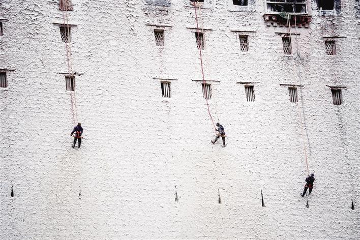 據(jù)悉,工作人員要先對涂料進行過濾,然后再進行噴灑。而人力無法抵達的地方則由專業(yè)人員化身“蜘蛛人”用涂料噴槍進行粉刷。在高空作業(yè)的“蜘蛛人”是經過培訓的特定人員,“蜘蛛人”懸掉在空中,并有專人負責拉繩,大家齊心協(xié)力完成粉刷工作。