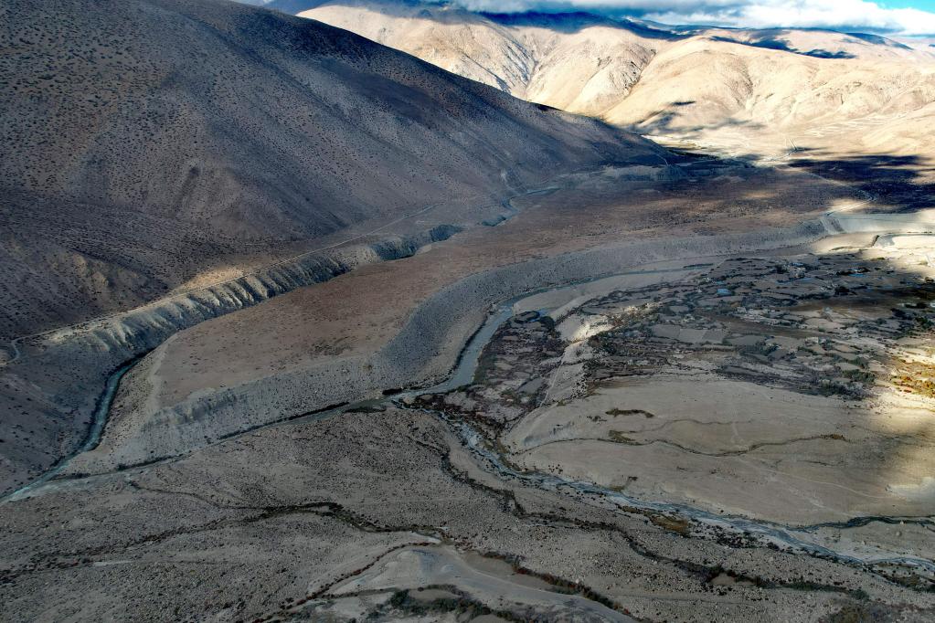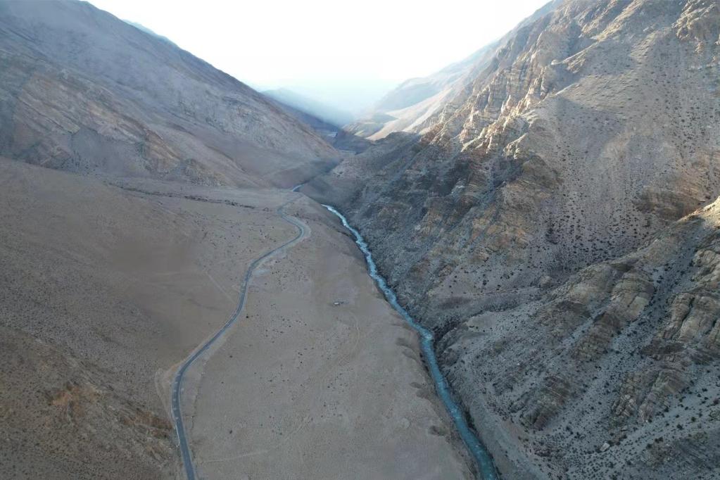 離開(kāi)參木達(dá)村,沿扎嘎曲逆流而上行駛約20分鐘后,公路旁的扎嘎曲開(kāi)始在峽谷中東西向蜿蜒而行,進(jìn)入整條河流的最狹窄處。記者在S516省道29公里處停車(chē)航拍,只見(jiàn)公路與河流像兩條平行的曲線(xiàn),時(shí)遠(yuǎn)時(shí)近,向遠(yuǎn)方延伸。