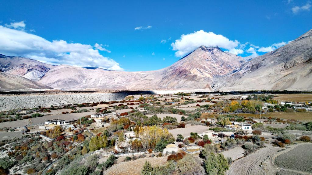 十月下旬,記者驅(qū)車(chē)來(lái)到曲當(dāng)鄉(xiāng)參木達(dá)村。透過(guò)航拍中的無(wú)人機(jī)遙控器顯示屏,記者看到,藏式民居在秋色浸染的樹(shù)木映襯下錯(cuò)落有致,秋日照耀下色彩斑斕,村東有巍峨的雪山、村西是奔騰南去的河流。