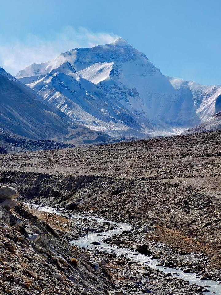 來(lái)到曲宗村,從這里搭乘珠穆朗瑪峰景區(qū)運(yùn)營(yíng)的環(huán)保客車(chē),前往絨布寺附近海拔5000米左右的游客大本營(yíng)。一路上坡,河流與公路隨行,偶爾可見(jiàn)有支流匯入扎嘎曲。
